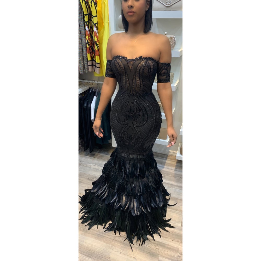 Black Beauty is here and ready to make you everyone’s dream girl! The black mermaid gown features sequin all around the gown so that with every move you shimmer and shine. It’s off the shoulder neckline exudes elegance and even more so when the sequence fades into a sea of beautiful black feathers.